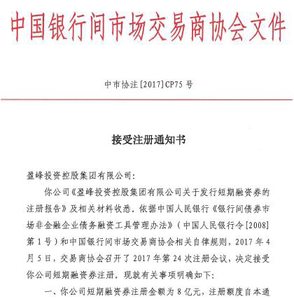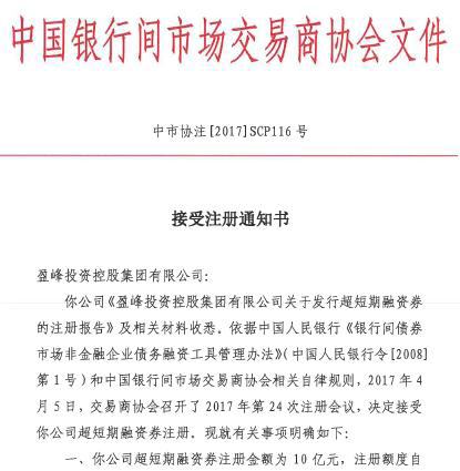 2017年4月,盈峰投資控股集團(tuán)有限公司(以下簡(jiǎn)稱:盈峰控股)接到中國(guó)銀行間市場(chǎng)交易商協(xié)會(huì)的通知,盈峰控股成功注冊(cè)38億債券,其中包含中期票據(jù)20億,短期融資券8億、超短期融資券10億。